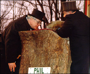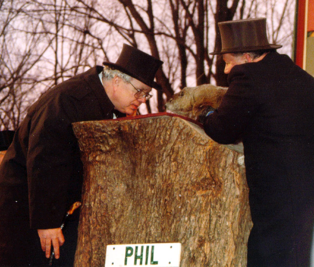 Newly appointed Groundhog Club President Bill Cooper listens to Phil for forecast.