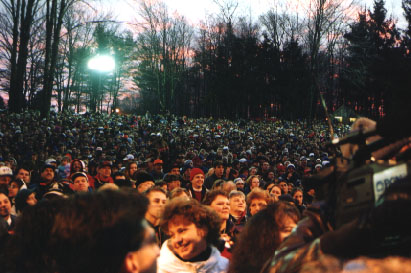 5:15am - Using my special Groundhog Day Press Pass, I make my way through the thousands of people to get to the front. In the process, I got nailed in the head by two falling "moshers." Didn't appreciate it one bit. Also, I managed to break a wooden fence while climbing into the press area. Woops! Mental note: Diet starts tomorrow.