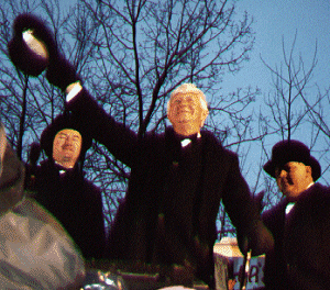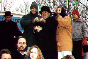 - Groundhog Club President Bud Dunkel greets the crowd.